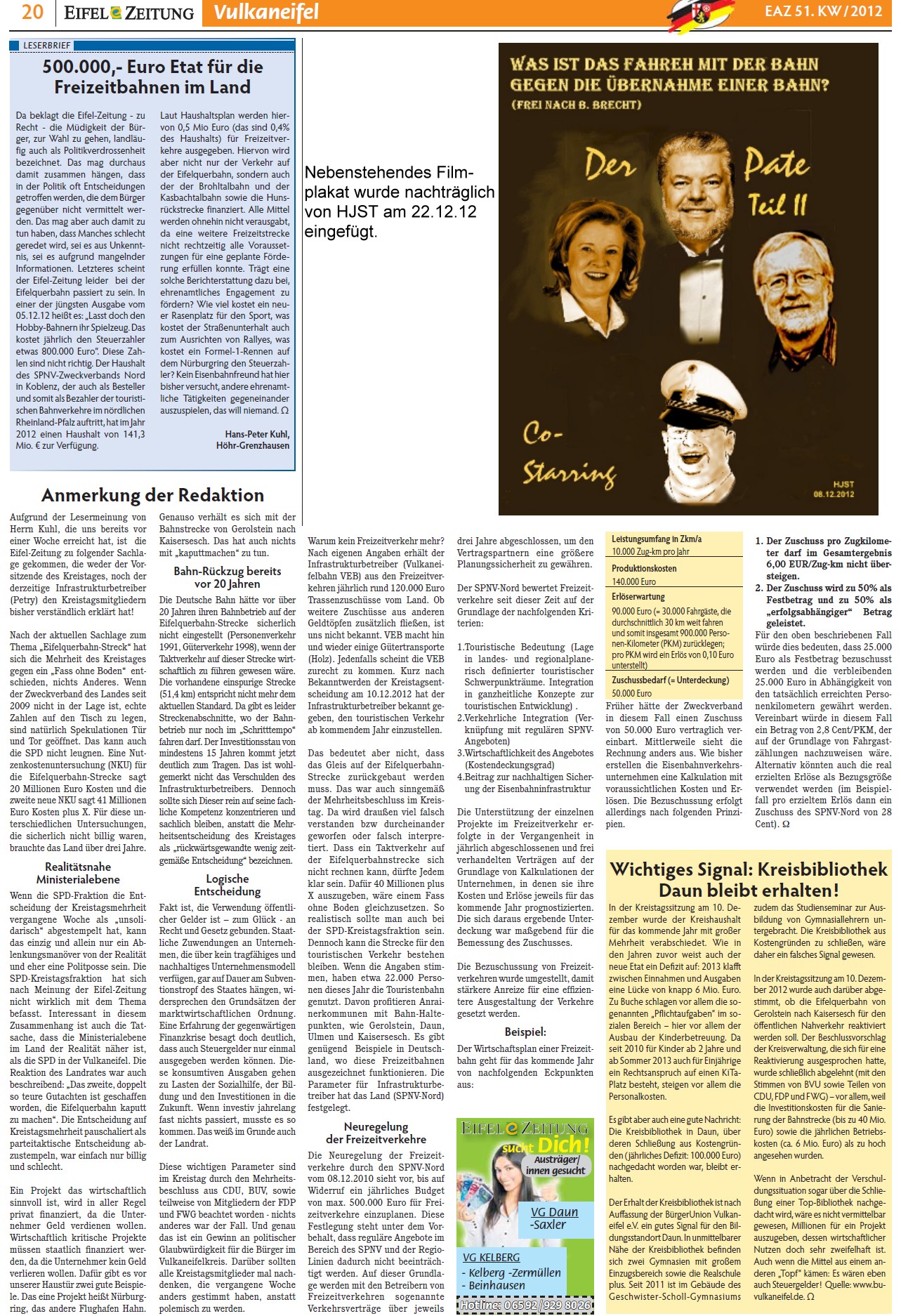 Eifelzeitung KW 51 Leserbrief H. P. Kuhl / Anmerkung der Redaktion (22.12.12)