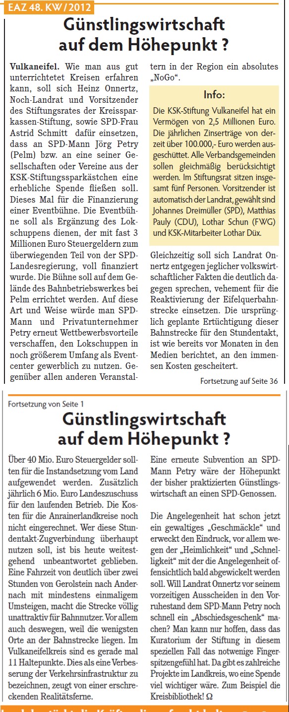Weitere Informationen zu der “PetryPauly - Günstlingswirtschaft” seit 2005 (die West- Eifelbahn betreffend) im Trierischen Volks- freund vom 30.11.2012: “Entscheidung über Bahnstrecke erst im kommenden Jahr”