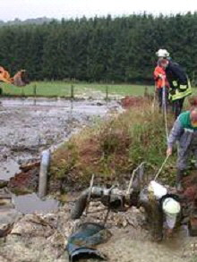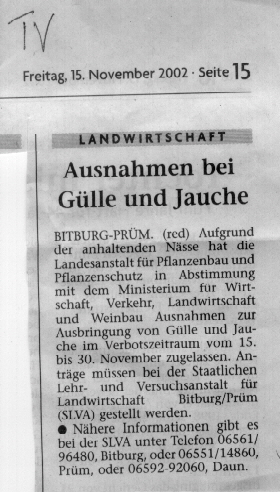 GEROLSTEIN-BÜSCHEICH. (vog) Entwarnung: Durch den Unfall, bei dem vorgestern rund 100 000 Liter Gülle ausgelaufen waren, wurde zwar der Büttenbach vergiftet, in der Kyll wurde aber nur im Mündungsbereich eine minimale Verunreinigung gemessen. Dennoch ordnete das Wasserwirtschaftsamt an, die Gülle aus dem Bach und von der angrenzenden Wiese zu pumpen.